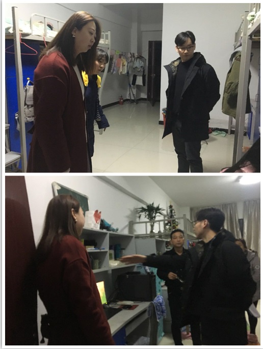 一进宿舍,老师就与同学们进行了亲切的交谈,询问同学们的学习、生活情况,温馨提示同学们天气变冷,注意保暖。交谈过后,各位老师在宿舍里进行了仔细的检查,查看宿舍是否存在安全隐患。有的同学缺乏安全用电意识,存在将电插板放在床上方便充电的情况,一旦发生火灾,后果不堪设想。宿舍楼部分楼顶和靠西的宿舍存在漏水现象,特别是宿舍屋顶漏水,屋顶装有电线,存在安全隐患。老师们还对宿舍的门窗、照明设备等一一进行了排查。对于由于学生原因造成的安全隐患,老师们对相关学生讲解了宿舍存在安全隐患的危险性并对同学们进行了安全教育。对于其它原因产生的安全隐患,老师们全部记录了下来,汇总后向学校有关部门上报解决。