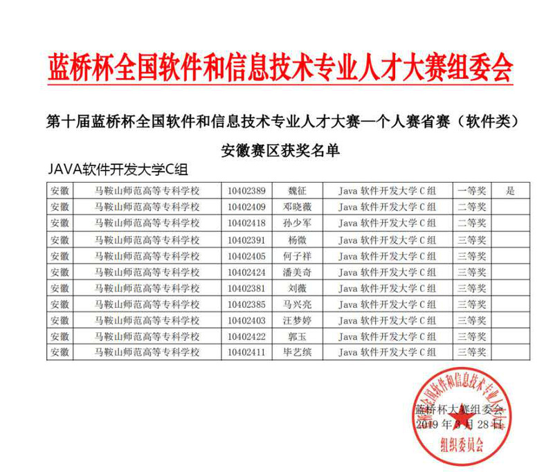 本网讯 3月28日,喜报传来,马鞍山师范高等专科学校软件工程系在由教育部高等学校计算机科学与技术教学指导委员会、工业和信息化部人才交流中心共同主办的“全国软件专业人才设计与创业大赛”暨第十届蓝桥杯大赛省赛中取得优异成绩,学校软件工程系(软件与互联网学院)24名同学获奖,4名同学进入国赛。