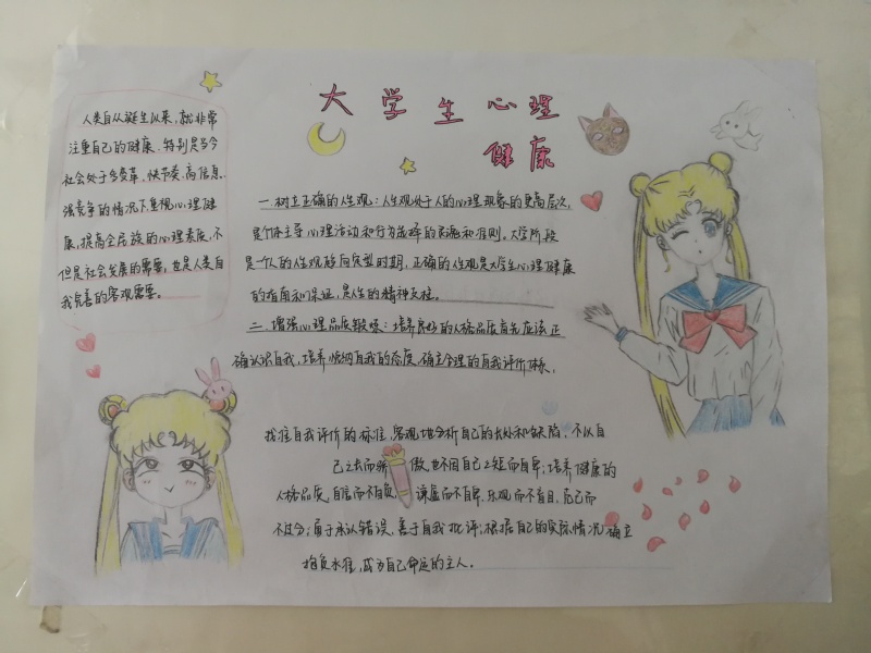 本次活动的参赛者是软件工程系2017级、2018级学生,他们通过制作“心漫画”和“心理健康手抄报”的形式,向系部全体同学宣传心理健康知识,表达健康、积极向上的生活态度。同学们自己收集各种资料、图片,设计、制作漫画、手抄报,将自己的心灵之声绘画成立意新颖、创意独特的手抄报,用最绚丽的图案、最生动的语言文字、最真实的情感,展示了“我阳光,我健康,我快乐”的生活态度,提高了同学们制作漫画、手抄报的能力,增强了同学们的心理素质。最后,经过评审,2018级软件技术3班的马子涵同学脱颖而出,获得了本次比赛的一等奖。