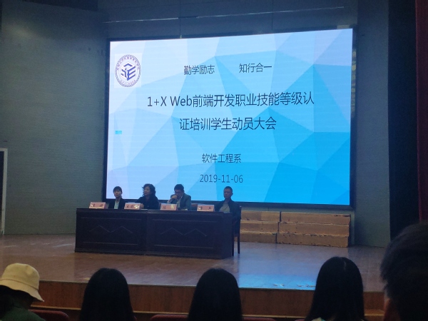 本网讯 为贯彻《国家职业教育改革实施方案》,积极推进“学历证书+若干职业技能等级证书”制度试点工作,马鞍山师范高等专科学校软件工程系于11月6日在本校音乐厅举办1+X Web前端开发职业技能等级认证培训学生动员大会。本次大会诚邀教务处处长陈平,教务处副处长鲁兵,软件工程系教研室主任虞娟及各位辅导员作为本次大会的现场嘉宾。会议由软件工程系党总支副书记王莉娟主持。