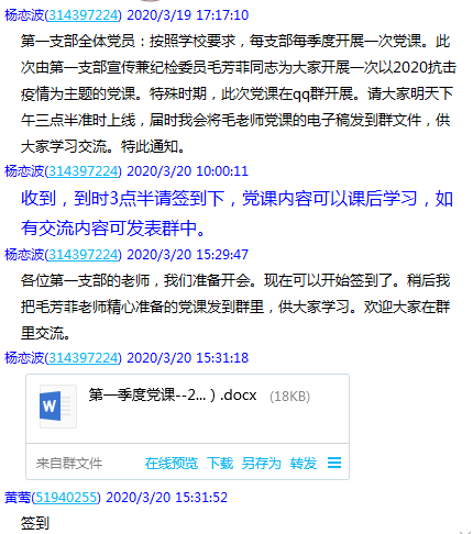 本网讯 软件工程系第一党支部于3月20日下午15点30分,第一支部宣传兼纪检委员毛芳菲同志以《2020年抗击疫情专题党课——发挥党员先锋模范作用,取得疫情阻击战彻底胜利》为题,利用QQ平台为本支部党员们上了一堂特别的微党课。