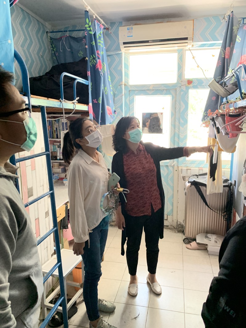 王莉娟一行走访检查了各年级宿舍,重点查看是否有私拉乱接电线网线、使用违规电器、宿舍还未进行通风消毒等情况。通过认真细致地检查发现,大多数学生宿舍卫生状况良好,无重大安全隐患,但仍有少数宿舍存在生活垃圾存积较多、宿舍天花板漏水等问题。王莉娟表示,在学生返校前及时把情况反馈给宿管中心进行维修,保证在学生返校后能够安全使用,为学生营造良好的住宿环境,配合学校做好疫情防控工作。