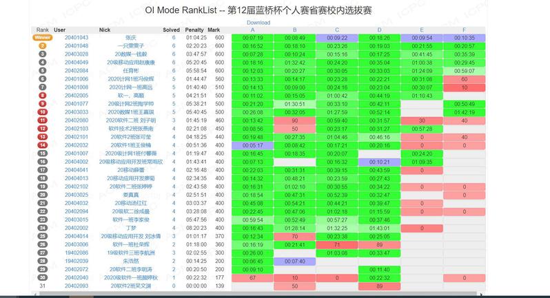 蓝桥杯大赛连续两年入选全国普通高校学科竞赛排行榜,我校学生近年来参加蓝桥杯比赛也取得了不错的成绩,对系部的整个学风建设起到了积极的作用。为规范参赛流程,提高参赛水平,系部对参加省赛的选手进行了现场选拔。选拔赛通过校内OJ平台完成赛题的发布、 程序的提交和成绩评定。通过两个小时的角逐,最终选出13名同学参加蓝桥杯省赛。