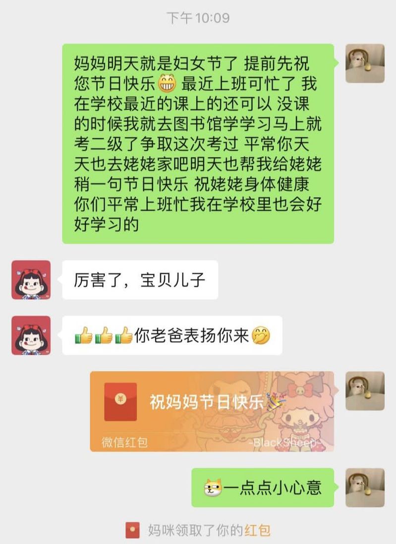 妇女同志们是美丽与创造的象征,她们用勤劳的双手装扮着幸福美好的生活。今天,软件工程系的同学们有的给母亲打个电话说说家常,有的发一段深情的文字表达自己的祝福。在妇女节这一天为她们送上真挚的祝福,让她们听到我们温馨的祝福,感受节日的惊喜和快乐,消解一天的劳累,脸上洋溢幸福的微笑。