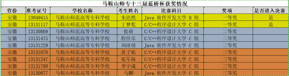 马鞍山师专在竞争越来越激烈的蓝桥杯比赛中再获佳绩,与指导教师陈平、张小翠、甘丽、毕波老师的辛勤指导和同学们平日里紧张的训练密不可分,同时也在学生群体中树立了良好的榜样。希望通过本次比赛,参赛队员们及时总结比赛经验,今后不忘初心,不懈努力,取得更加优异的成绩。(图文/甘丽 编辑/曾甜 审核/王莉娟)