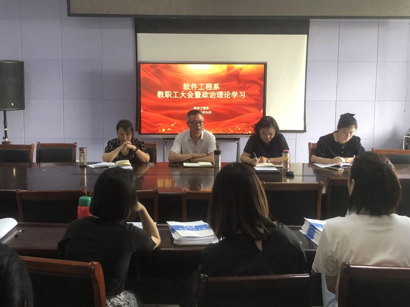 本网讯 6月24日上午,软件工程系在行知楼601召开期末教职工大会暨政治理论学习会。系主任鲁兵、党总支书记王莉娟、副主任杜丹、组织员曾甜出席会议,全体教职工参加会议。
