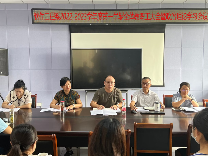 本网讯 8月29日上午,软件工程系在行知楼601会议室召开2022—2023学年第一学期教职工大会暨政治理论学习会。校党委委员、副校长周志亮,软件工程系党总支书记王莉娟、副主任鲁兵、杜丹、组织员曾甜出席会议,全体教职工参加会议。