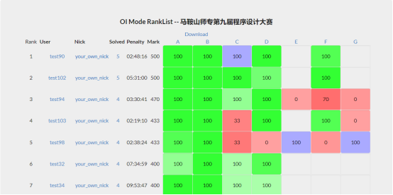 大赛分为初赛和决赛两个阶段。初赛阶段,通过近5个月的OJ系统训练,综合OJ系统排名前100名学生和语言类课程老师推荐,选拔出决赛现场赛选手。决赛阶段是以现场赛的方式,通过OJ系统进行比赛,借助OJ系统平台完成赛题的发布、程序的提交和成绩评定。通过比赛角逐,最终评选出获奖情况共计一等奖7名、二等奖11名和三等奖 20名。