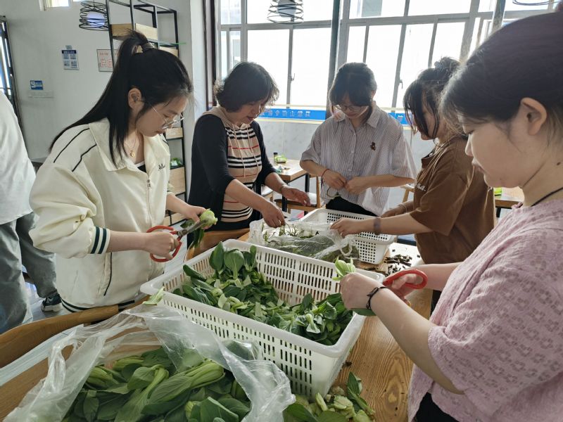 上午八时,大家在食堂工作人员的指导下,分组行动、相互配合,有的打扫卫生、有的摘菜洗菜,在劳动中交流心得、沟通思想,安静的食堂瞬间热闹起来。经过近一个小时的辛勤劳动,食堂大厅窗明几净,案板桌台前摘洗过的食材摆放整齐,大家在欣赏自己劳动成果的同时也体悟到各行各业的艰辛不易,感恩食堂工作人员提供美味可口的饭菜。