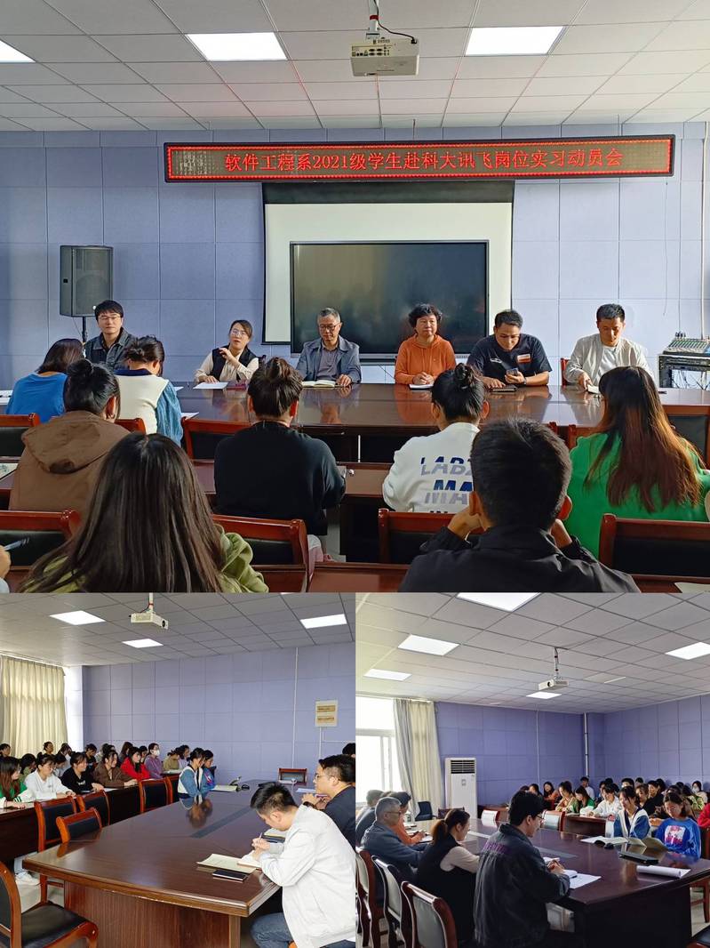 为推动2021级毕业生毕业实习工作顺利开展,切实提高学生就业能力,2023年10日9日上午十点在行知楼601会议室召开了软件工程系2021级学生赴科大讯飞岗位实习动员会。出席本次会议的有软件工程系主任鲁兵、党总支书记王莉娟、副主任杜丹及各班辅导员。