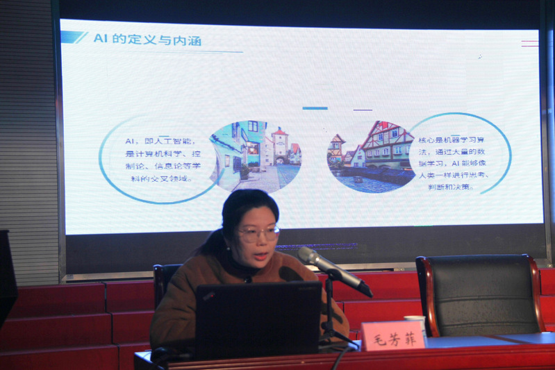 此次讲座主题为:AI模型助力老年大学教学:实操与应用。讲座上,毛芳菲首先介绍了AI 的定义与内涵,指出 AI 即人工智能,是多学科交叉领域,核心为机器学习算法,能模拟人类思考决策。