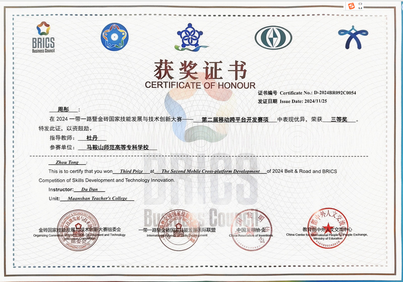 作为团队负责人,周彤同学在2025年安徽省职业院校技能大赛中展现出强大的组织能力与专业实力,带领团队一路披荆斩棘,荣获团队二等奖。此外,她还积极考取专业相关证书,全国计算机二级证书、1+X Web前端的初级以及中级证书、计算机程序设计员(高级)证书等,这些证书如同阶梯,一步步搭建起她坚实的专业技能高塔。